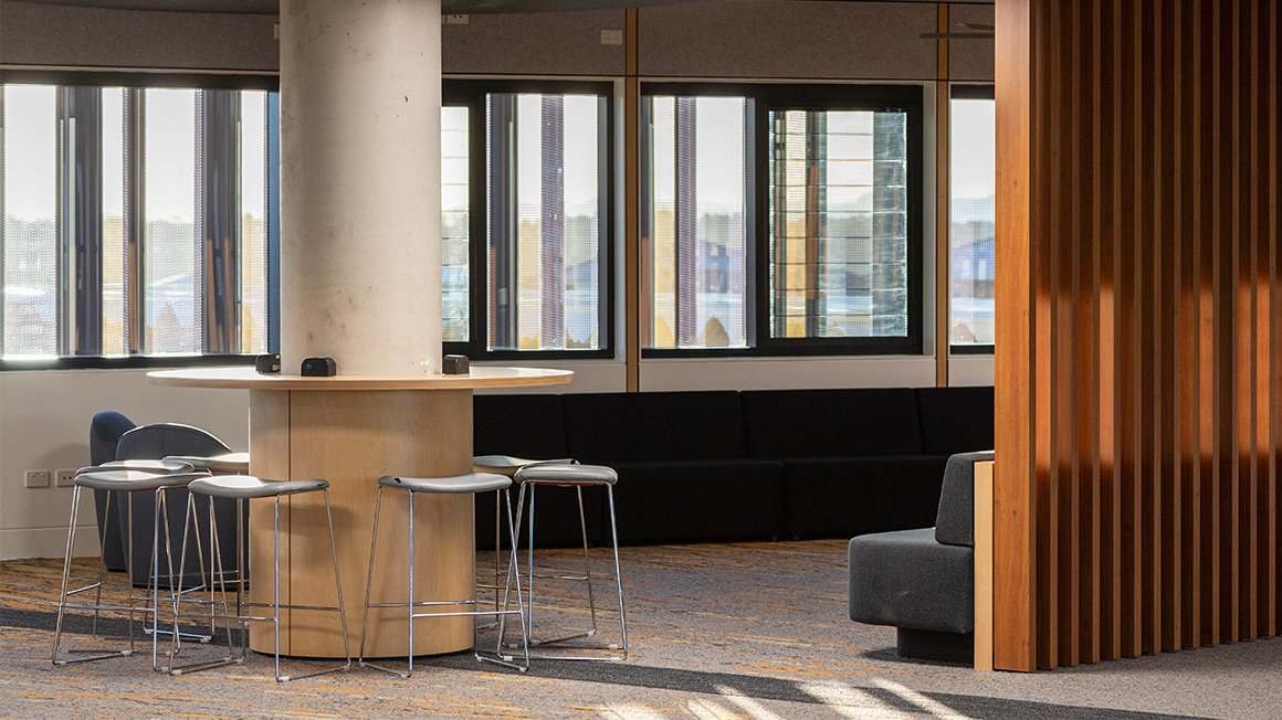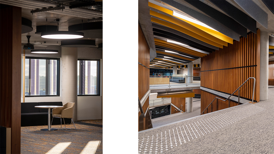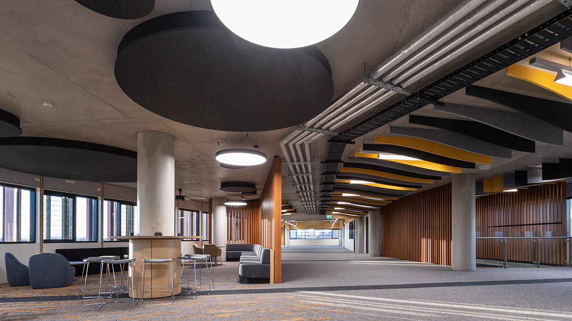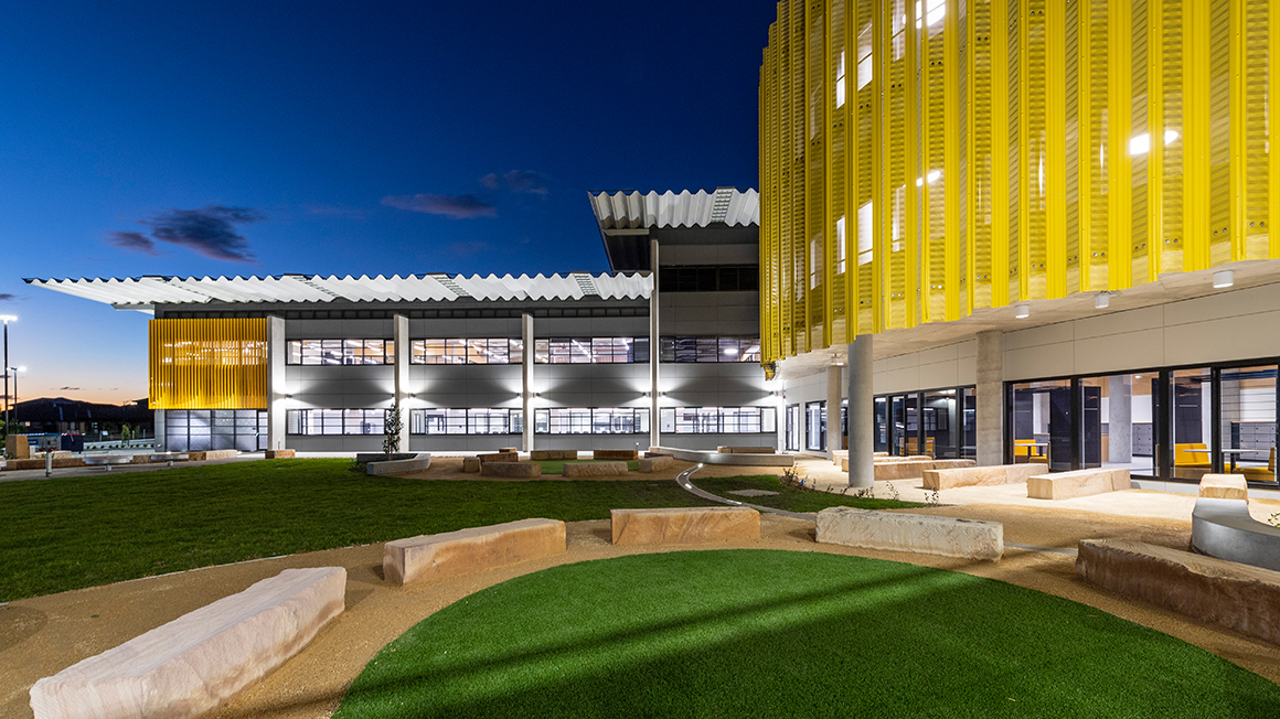 The internal circulation spine, known as the ‘Peregrine trail’ (Peregrination: a meandering journey of discovery), is an organic form, which wraps along the existing contours of the site. The use of this space, apart from internal circulation from building to building, is allocated for flexible and adaptable teaching and learning modes, exhibition space, connectivity to landscape, natural day lighting & ventilation.