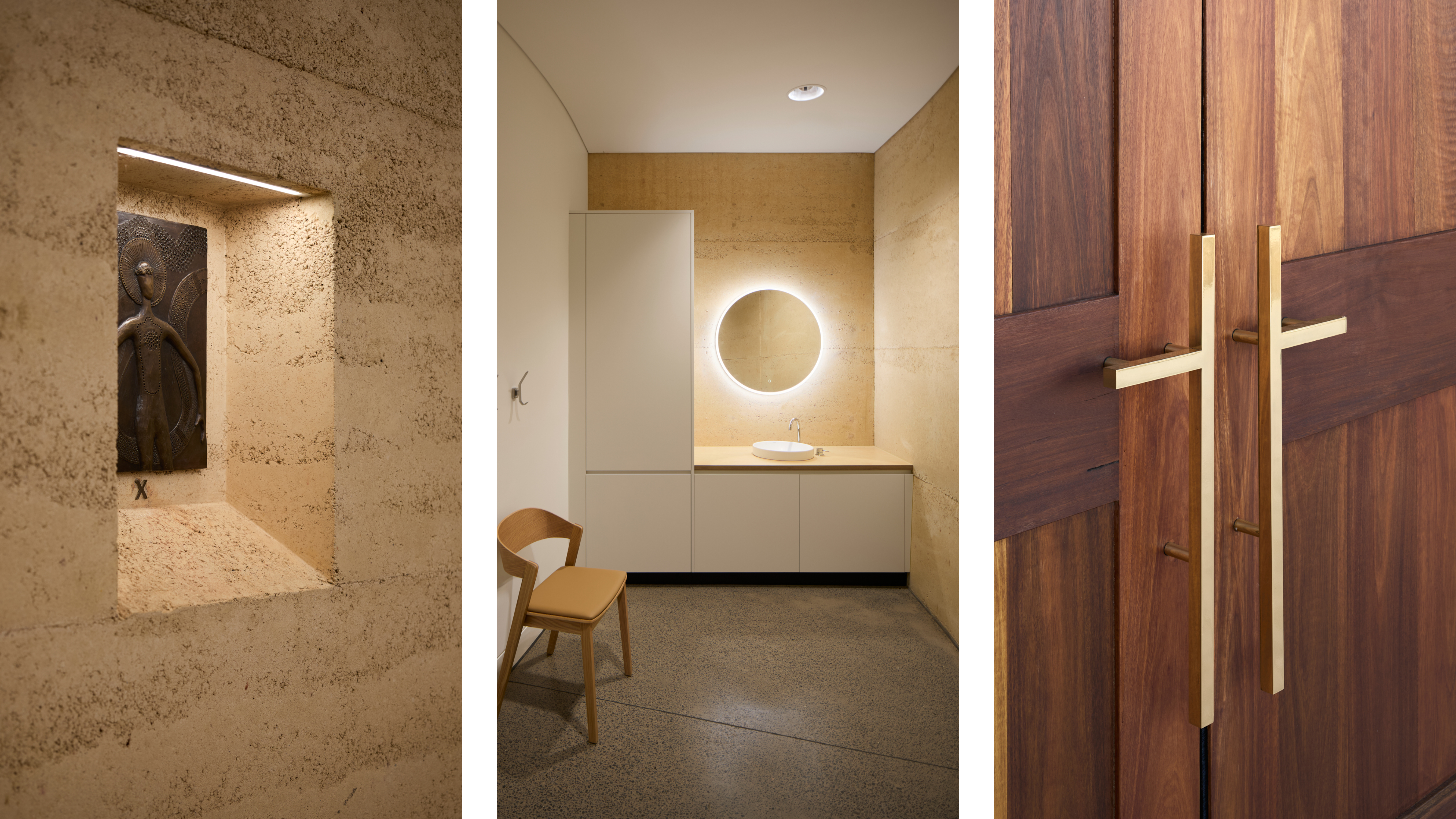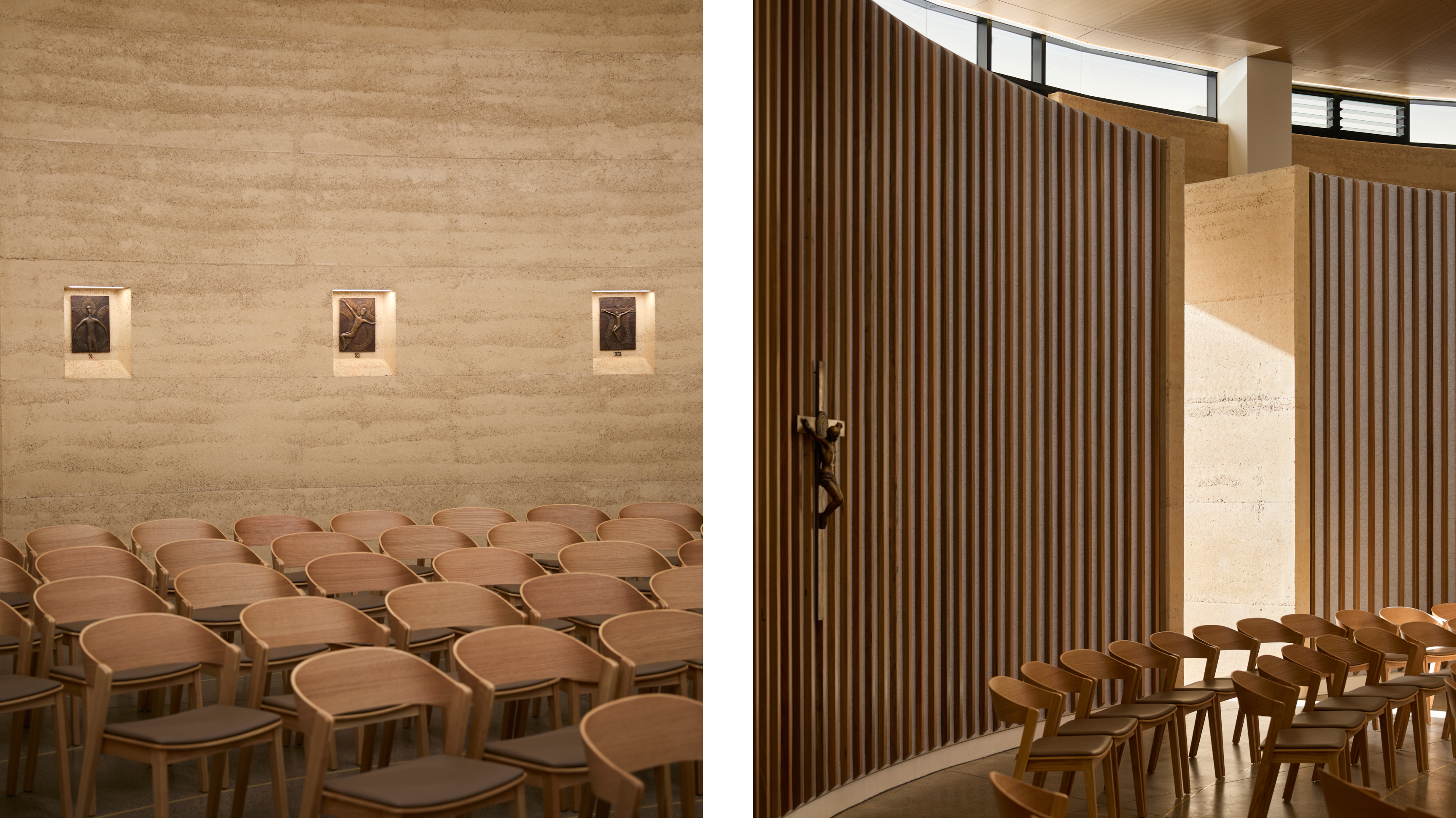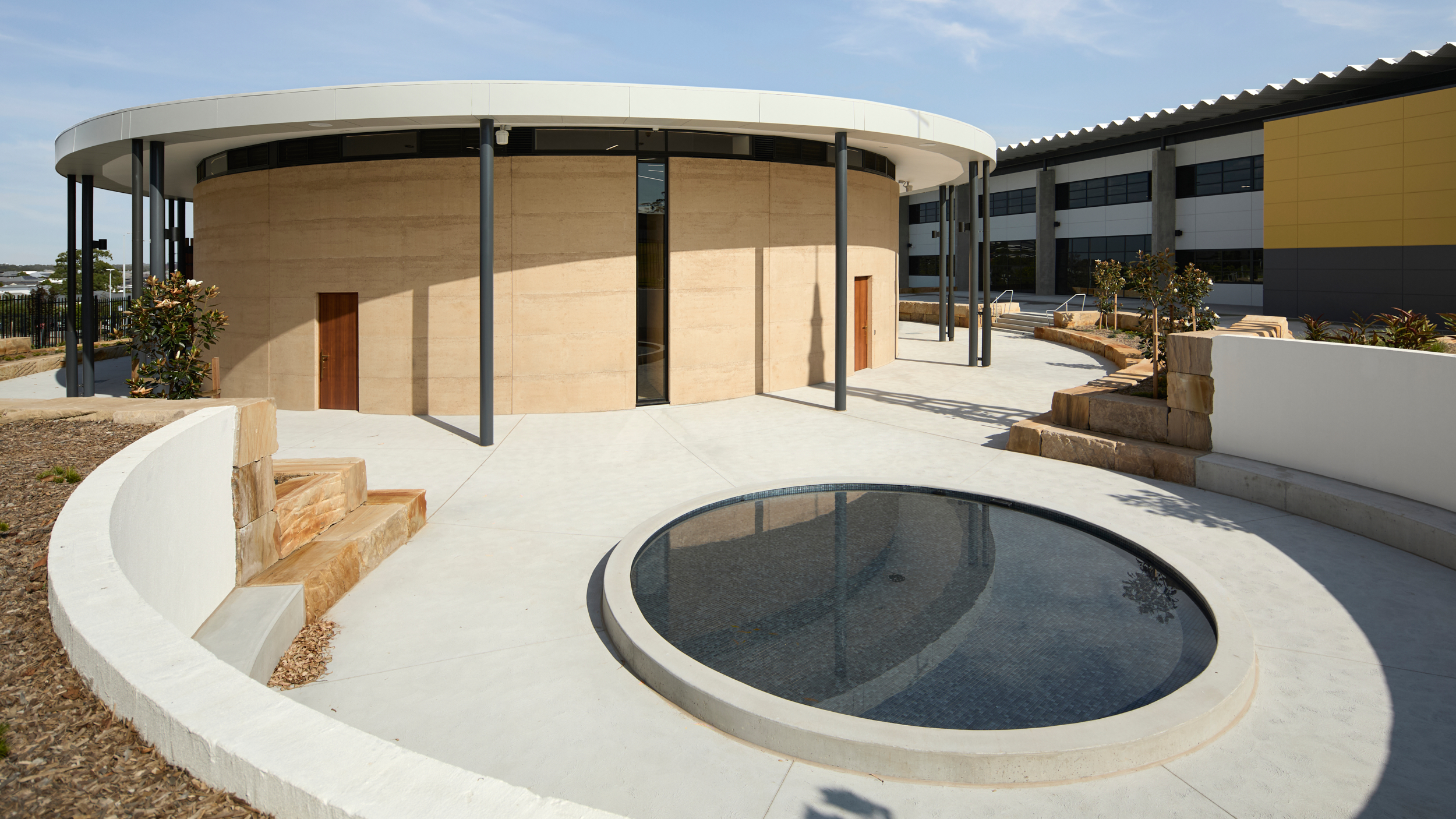 The Oratory is designed in the round as a rammed earth structure with a centralised altar space, to create a solemn atmosphere, grounded into the site. The project also includes a large campanile structure, visible from many parts of the surrounding suburb, and reflection pond, with statues to Virgin Mary, St Aloysius and St Bede included.